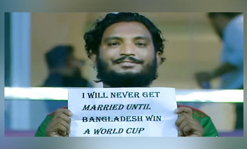 বাংলাদেশ তখন ব্যাট করছে আমিরাতের বিপক্ষে ম্যাচের প্রথম ইনিংসে। চার বল হয়েছে, এরপরই ক্যামেরা ধরা হলো গ্যালারিতে। স্ক্রিনে ভেসে উঠল সেই সমর্থকের হাতে ধরা প্ল্যাকার্ডও। যেখানে ইংরেজি হরফে লেখা, ‘I will never get married untill Bangladesh win a world cup.’ বাংলায় অনুবাদ করলে যেটা দাঁড়ায়, ‘বাংলাদেশ বিশ্বকাপ না জেতা পর্যন্ত আমি বিয়ে করব না’