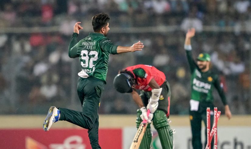 দুই ওপেনার ফেরার পর তিনে নেমে মোহাম্মদ হারিস আজও ব্যর্থ। তাসকিন আহমেদের বলে ফিরেছেন ১৪ বলে ৫ রান করে। মাঝের ওভারগুলোতে হাসান নাওয়াজ রানের চাকা সচল রেখেছিলেন। হাসান ১৭ বলে ৩৩ রান করে ফিরলে শেষ দিকে মোহাম্মদ নাওয়াজ কার্যকারী একটা ইনিংস খেলে পাকিস্তানকে চ্যালেঞ্জিং স্কোর এনে দিয়েছেন।