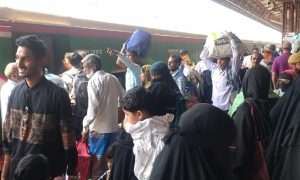 রাজবাড়ী রেলস্টেশনে ট্রেনে ঢাকামুখী যাত্রীদের ভিড়